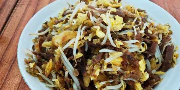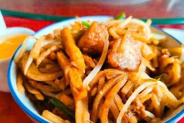 2、鍋底加油,油熱時放入蔥花烹出香味時,放入牛肉、丸子、腐竹、木耳、炸豆腐翻炒,加入少許生抽、鹽攪拌均勻,放入餅絲翻炒,如果粘鍋小點火改成煸炒,五分鐘後淋上香油出鍋即可。