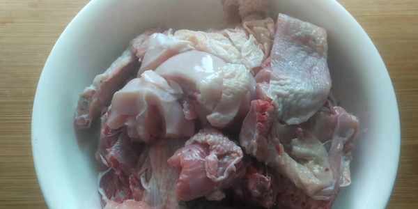 第一部:準備半隻雞肉,有條件的用烏雞肉,把雞肉洗凈切小塊,也不要切得太碎瞭影響口感,全部切好放碗裡備用;然後把薑切片。