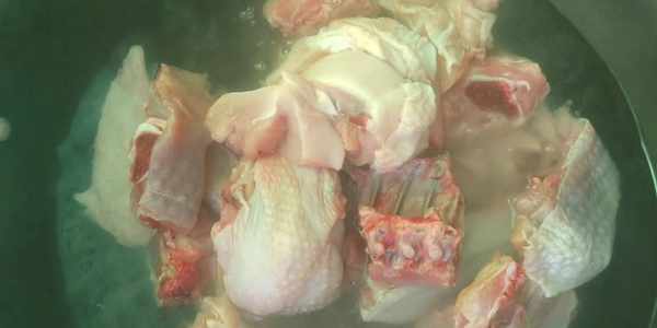 第二部:起鍋燒水,冷水放入雞肉焯水,然後倒入一勺料酒去腥味,水開撇去浮沫,再煮一分鐘;雞肉焯好水撈起瀝幹水用清水沖洗幹凈。