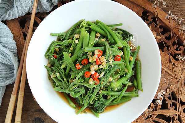 食材:南瓜苗 適量、香醋 1勺、鹽 少許、蒜末 適量、生抽 2勺、辣椒 適量