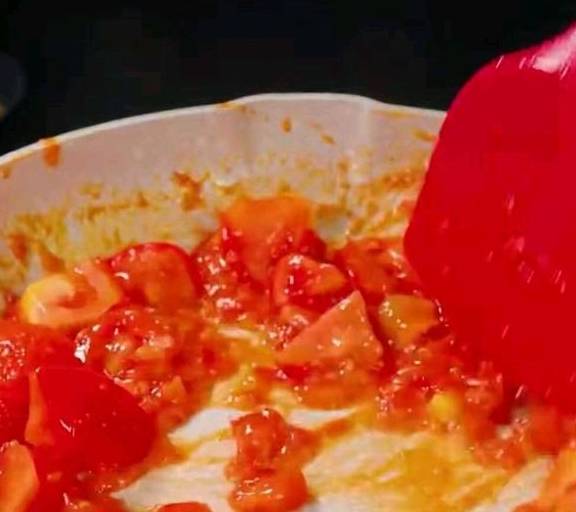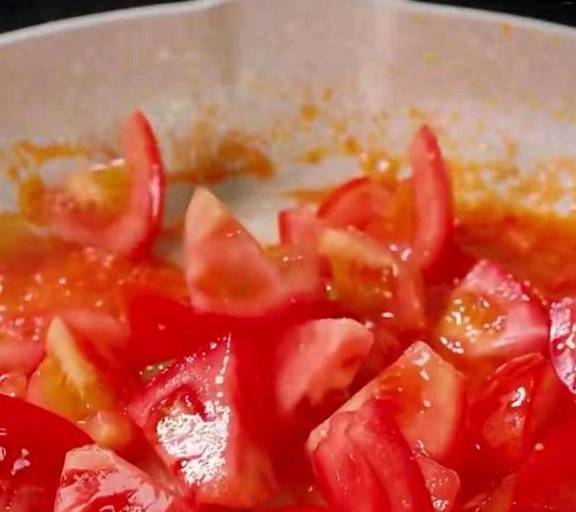 5、另準備一鍋,鍋中倒入適量食用油,放入小塊西紅柿,用中火翻炒直到番茄化成湯汁。