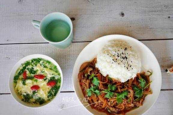 最近挺忙的,經常是沒時間給自己做飯。好在這些天傢裡就自己一人,所以吃飯就特別隨意。但是也盡量能保證三餐正常,早餐是可以穩定的常態化,一稀一主食一小菜便可。午餐是習慣瞭吃米飯,一菜一湯,夠吃不浪費,隔三差五會做蓋飯,覺得一人食蓋飯更簡便,食物也可以更豐富些,米飯粘裹上菜的醬汁,特別鮮香有滋味。