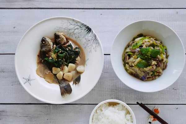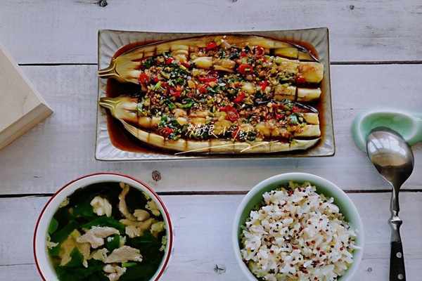 藜麥飯|蒸茄子|紅薯葉肉片湯