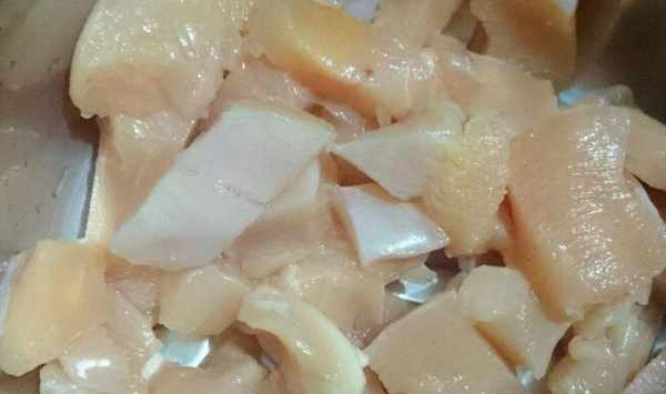 第二步:將清洗乾淨的雞胸肉放在案板上切成小塊裝在絞肉機裏加入適量的料酒一大勺鹽,半勺胡椒粉,2大勺澱粉,200克左右的冰塊,再倒入適量的清水蓋上蓋子將它打成雞肉泥備用。