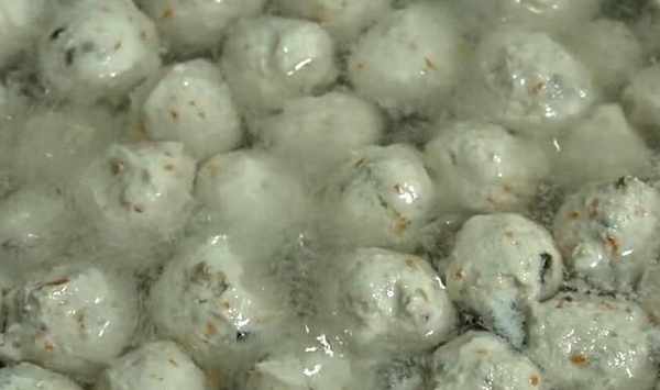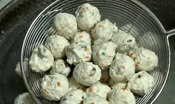 第四步:鍋中倒入水,水開之後轉小火,讓水保持微開的狀態,用手取出一小塊餡料,用虎口狀擠出丸子,將丸子都下入到鍋中,全部下好之後開小火煮一會兒,大約煮3分鐘左右,煮至丸子全部漂浮起來,香菇雞肉丸就做好了。