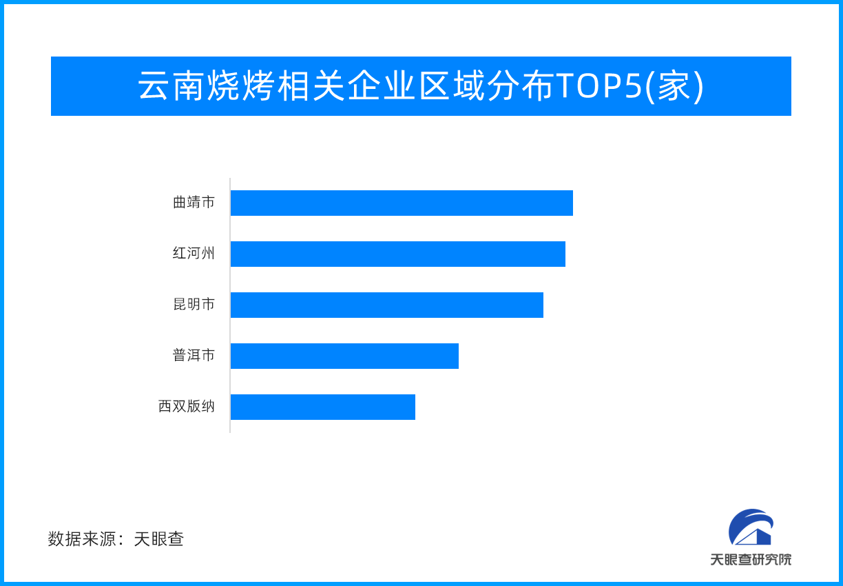 從地域分佈來看,雲南以4.8萬餘傢位列區域首位;山東、四川分列二、三位,分別擁有4.3萬餘傢以及3.6萬餘傢;其中,從2023年一季度數據來看,雲南地區新增燒烤相關企業2.3萬餘傢,與2022年同期相比上漲15.2%;