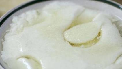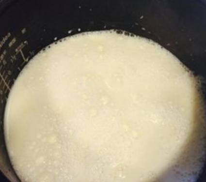 等到豆漿完全煮好之後放在一旁放涼到85度,趁著這個時間我們可以融化一些內酯,將三克的內酯用30毫升的溫水化開,也就是內酯和水要按1:10的比例化開,倒入電飯煲當中,先到內止水,然後再將已經涼到85度的豆漿倒入電飯煲當中,寫掉浮沫,蓋上蓋子,按下保溫鍵來保溫20分鐘就可以瞭。這樣嫩滑可口的豆腐腦就做好瞭。