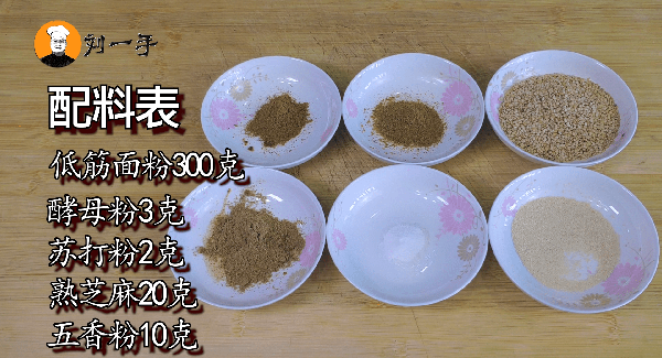 低筋面粉300克,酵母粉3克,蘇打粉2克,熟芝麻20克,五香粉10克,孜然粉5克,胡椒粉5克