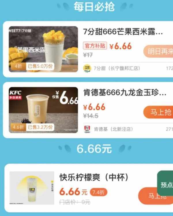平日在門店購買肯德基滿杯耶椰茶需要15.5元、7分甜的芒果西米露需要17元,快樂檸檬珍珠奶茶(中杯)需要12元、益禾堂西瓜火燒雲需要13元……這些熱門茶飲,現在均可在美團“666快樂星球”的活動中以6.66元“搶”走,屬實讓客戶實現瞭“奶茶自由”。