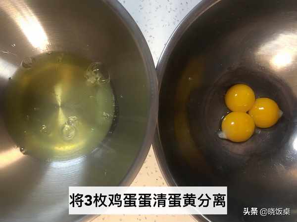 1.首先,找兩個沒有油或水的容器,然後將三個雞蛋的蛋清和蛋黃分開。