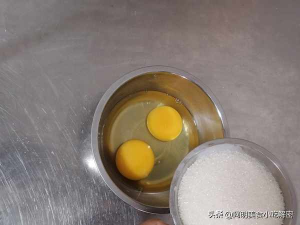 2、 兩個雞蛋,加入100克白糖,攪拌至沒有顆粒