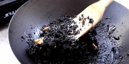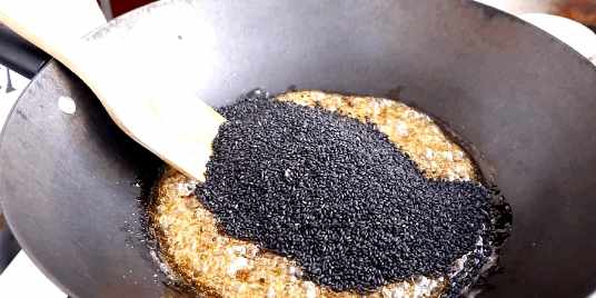 (2)洗好的黑芝麻倒入鍋中,開小火不停地翻炒,炒至吃起來幹幹的,且芝麻香味很濃出鍋晾凉。