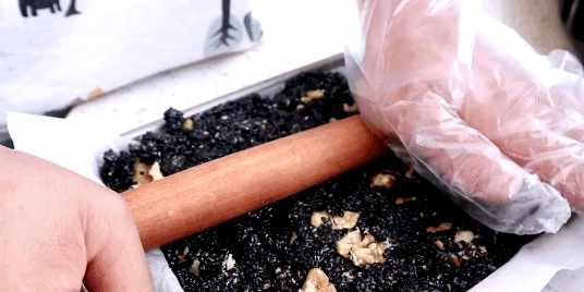 (7)模具提前刷上薄薄的一層熟油或者鋪上油紙,倒入拌好的芝麻核桃糖,用擀麵杖或者鏟子按壓平整。