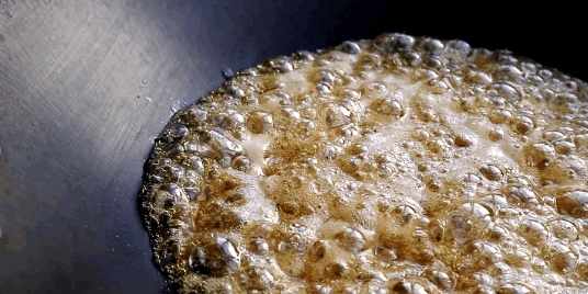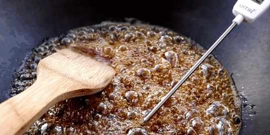 注意:140℃熬出的糖漿做出的糖軟硬程度適中,若是喜歡吃硬一點的口感,可以溫度到145℃再關火。若是家裡沒有溫度計的話,待糖漿的顏色變成琥珀色用筷子蘸一點放進冷水中,然後用手捏一下,如果變得脆硬剛好。