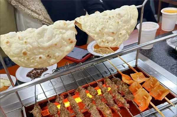 巴掌大的面餅烙至起泡,對折兩次,分別蘸上蒜蓉醬、幹料和辣椒,再夾入小蔥、肉串,一折一擼一卷,將天地間的食物精華收入囊中。滿口留香滿足瞭食客的胃,也給當地小餅生產企業帶來商機。