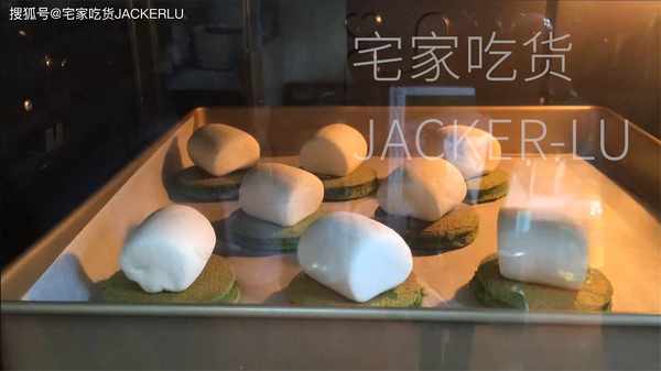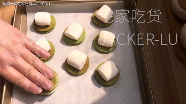 12、取一半蛋糕片,各放上一塊棉花糖,180℃烤制5分鐘。