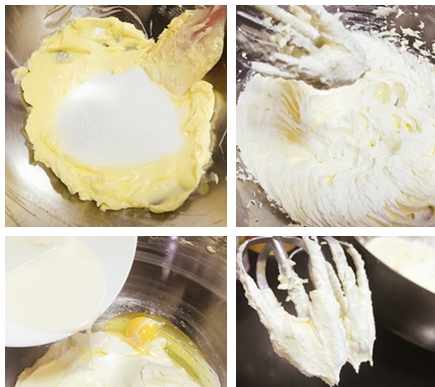 5.開始做外皮:黃油室溫軟化,放入糖,使用電動打蛋器,打發10分鐘左右,蓬鬆變白,輕盈如羽毛。加入淡忌廉和雞蛋,繼續打發成尖鉤狀。