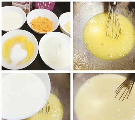 3.做中間層的金沙奶黃餡兒:雞蛋中加入糖攪拌勻,不需要打發。倒入牛奶和淡奶攪拌勻。篩入低粉,奶粉和玉米澱粉,攪拌成糊狀。