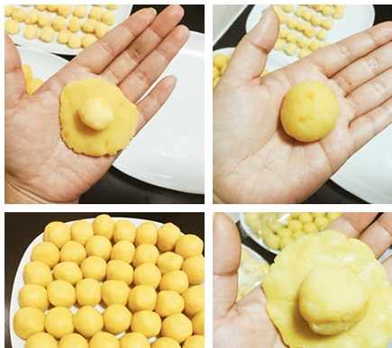 7.冷凍好的流心餡,冷藏好的奶黃餡,冷藏好的月餅皮分別平均分為45個,蓋保鮮膜防止變幹。迅速地用奶黃餡包好流心餡,密封冷藏30分鐘定型。