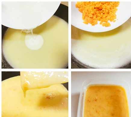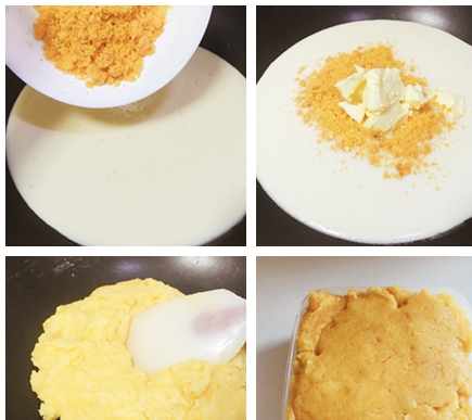 2.吉利丁片取出,瀝幹水。4個烤過的鴨蛋黃碾碎。將淡忌廉煉乳混合物中倒入鍋中,小火加熱,不停攪拌煮冒泡。倒入椰漿和玉米澱粉混合物攪拌著煮。加入碾碎的鴨蛋黃,攪拌著煮倒濃稠,可以掛在刮刀上,密封放入冰柜冷凍保存,凍硬!