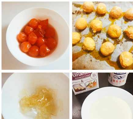 1.先做最內層流心奶黃餡:鴨蛋黃用料酒泡30分鐘,放入烤箱170度上下火烤6分鐘,備用。吉利丁片放入冷水中,入冰柜冷藏泡軟5分鐘。淡忌廉和煉乳混合拌勻,椰漿和玉米澱粉混合拌勻。