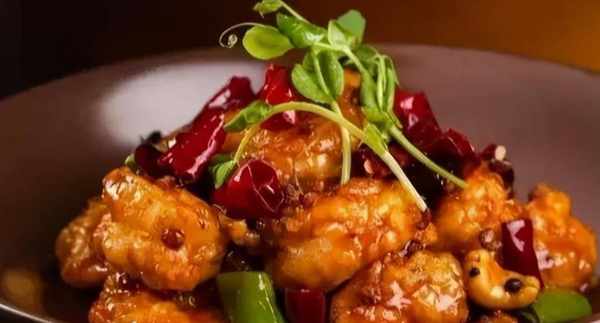 3、鍋留底油下蔥、薑、蒜、幹辣椒、花椒炒香,加宮爆汁勾芡,下蝦球,蜜豆、黃椒、腰果翻炒均勻,淋辣油出鍋裝盤即可。