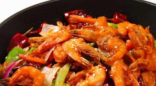 3.鍋置大火上,下植物油燒至四成熱,下豆瓣末、薑片、蒜片、蔥段炒香上色,放入幹辣椒段、花椒炒至辣椒呈棕紅色,放入草蝦翻炒入味,烹入料酒、味精、香油、花椒油、孜然粉,用手勺推炒均勻,起鍋將蝦擺入盤內成形即成。