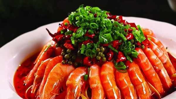 2.炒鍋內加入少許辣椒油燒熱,下小米椒段炒香,再加入鮮湯、鹽、雞精、白糖炒勻,然後用水淀粉勾芡,倒入盤中蝦上,撒入蔥花,淋上香油即可。