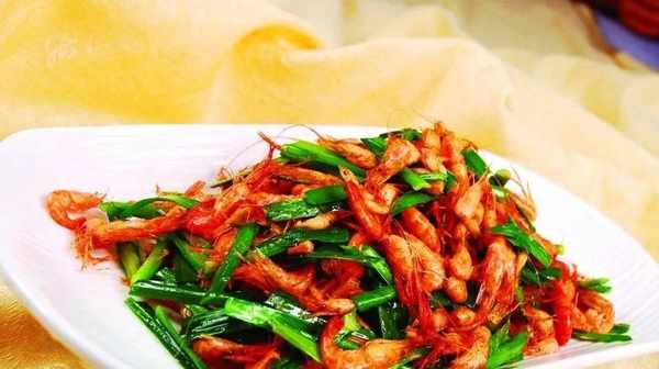 3.另起鍋放油燒熱,放入韭菜段略炒,再加入小河蝦及調料鹽、味精、香油炒勻即可出鍋裝盤。