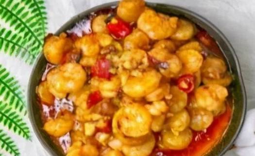 5、鍋留底油,下入調好的味汁和蝦,兜炒均勻後出鍋裝盤,最後撒上梅幹與紫蘇碎即可。