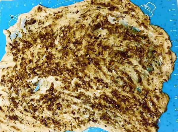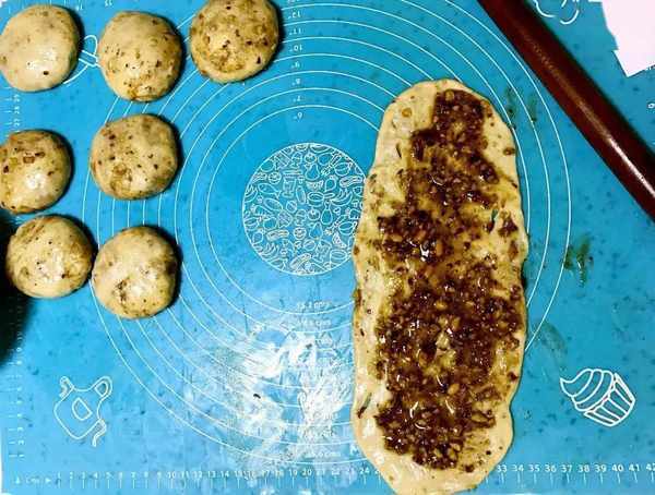 用手將麵團慢慢攤開,並均勻塗抹適量核桃花生油酥,卷起,分割成9份,兩頭捏住滾圓。