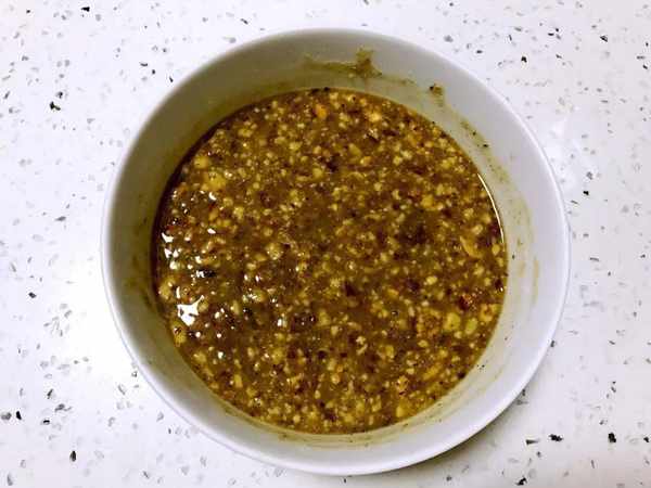鍋中倒植物油燒至微微冒煙,將油潑入裝核桃花生的碗中攪勻,油可略微多點。晾凉備用。(油不可燒太熱,否則會有苦味兒,若燒太熱,可晾一會兒再潑)