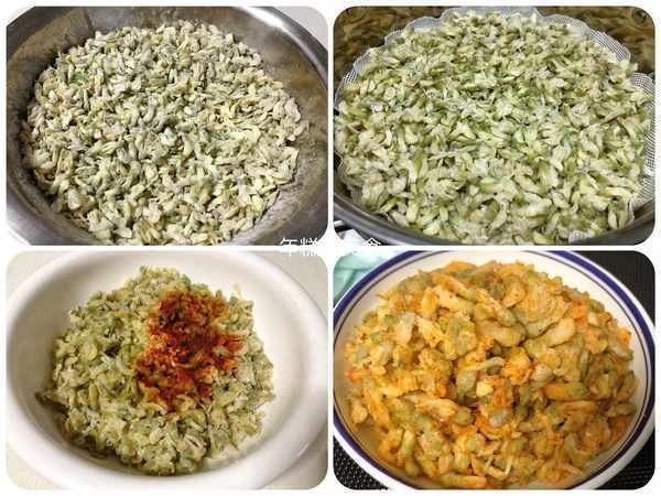 (1)新鮮的槐花多淘洗幾遍,將小葉柄濾出去,洗好再濾出多餘的水分