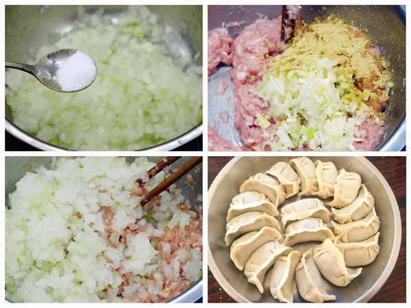 (4)冬瓜醃好後會出來很多水分,把水擠幹,擠好後和豬肉一起放到盆內,攪拌混合,冬瓜提前放瞭鹽,肉餡就不需要再放瞭
