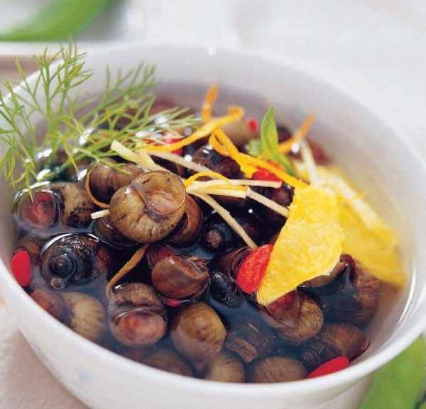2 鍋中加入清水燒沸,放入田螺、香橙、橙皮、枸杞、蔥花、薑絲、精鹽、胡椒粉、料酒、醬油煮約 5 分鐘,再撒入八角煮開,即可出鍋。