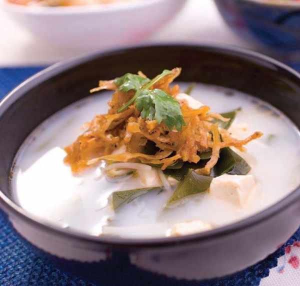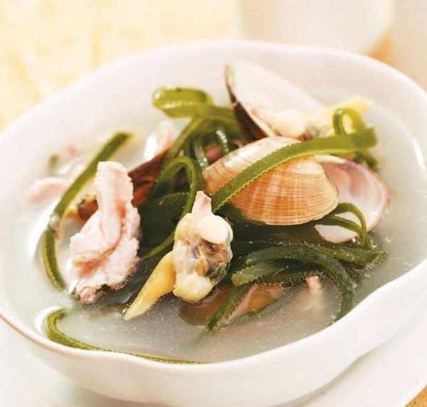 3 鍋中加油燒熱,下入薑片炒香,添入豬骨湯燒沸,放入海帶、豬肉煮約 15 分鐘,放入蛤蜊煮 5 分鐘,加入精鹽、雞精、胡椒粉調味即可。