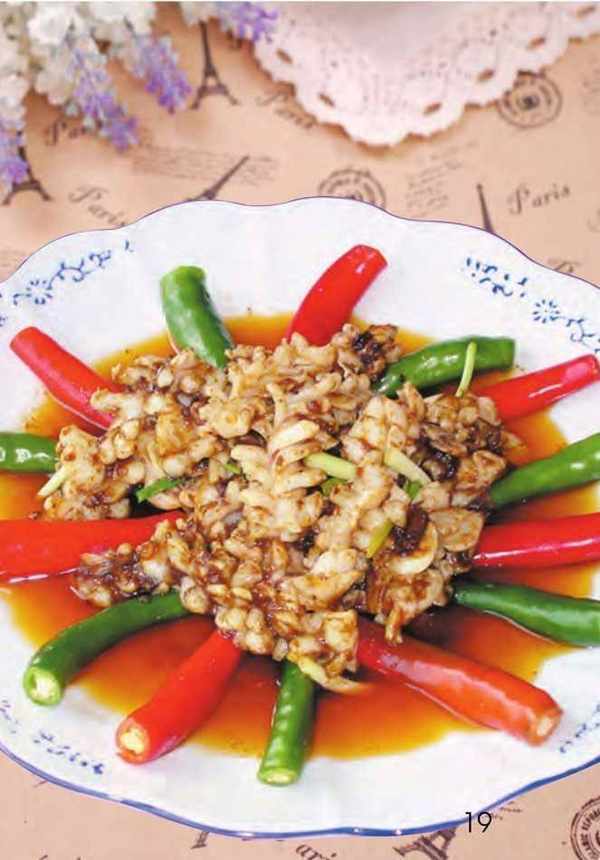 調料 精鹽 1 小匙,味精、雞精、白糖、老抽各 1/2 小匙,蒜蓉辣醬 1 大匙,料酒、水淀粉、辣椒油各 2 小匙,植物油 2 大匙。