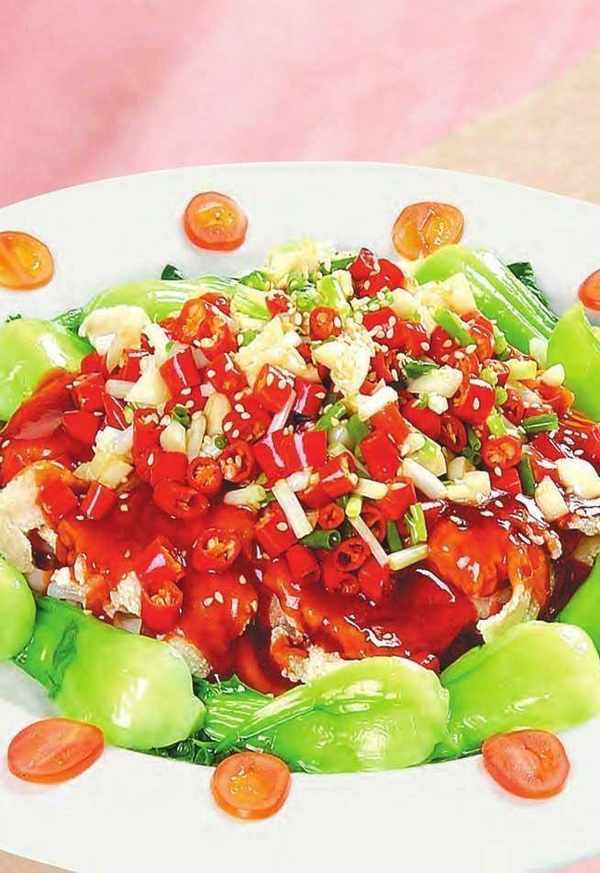 3 取出後撒上青椒丁、紅椒丁、香蔥末,再淋入熱油即成。
