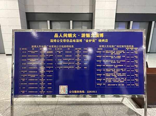 淄博火車站出站口的公交線路指示牌,清晰標明瞭各線路沿途知名燒烤店。(新華社記者 張超帆 攝)