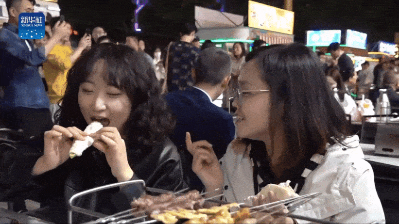在熱門打卡地,大約晚上7點,燒烤店門口排瞭幾百米的長龍,有人帶著馬紮,還有人帶著零食,交警在街頭路口維持秩序。來自江蘇的遊客說:“當地朋友下午2點多就來幫忙排隊瞭,現在終於吃上瞭。”不一會兒,燒烤店負責人拿起瞭小喇叭:“手裡沒菜單的別排隊瞭,店裡沒肉瞭。”