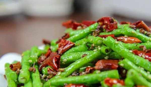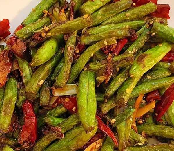 3.炒制豆角:將之前炸好的豆角放入鍋中翻炒,加入適量鹽繼續翻炒,等到豆角焦脆時,倒入調制好的醬料,翻炒均勻,炒至醬汁收幹即可出鍋。