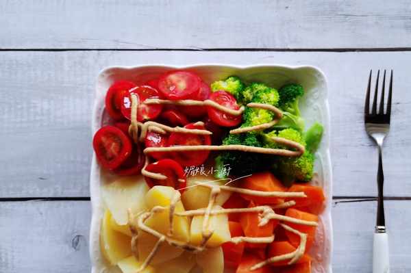 自己拳頭大小的土豆1個去皮洗凈切塊,胡蘿卜半根輕輕地削皮後洗凈也切小塊,一起放籠屜裡上鍋蒸熟,西蘭花最後4分鐘時放入,一同出鍋裝盤,聖女果洗凈對半切開裝盤裡,淋入自己喜歡味道的醬料即可。我有時是加海鹽和黑胡椒淋點橄欖油拌一拌吃,挺好,能吃到食物的原味。