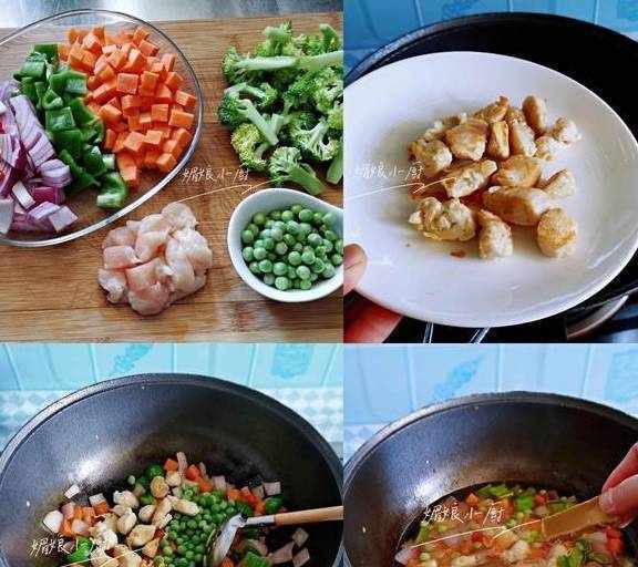 2、洋蔥、青椒、胡蘿卜、西蘭花、雞胸肉都洗凈切比較大一點的丁