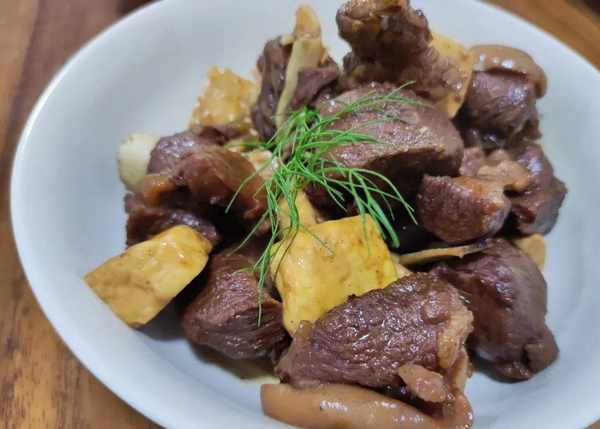 2.這美食中加入豆腐,營養加倍。經過燜煮後的豆腐口感咸香入味,嫩滑好吃。
