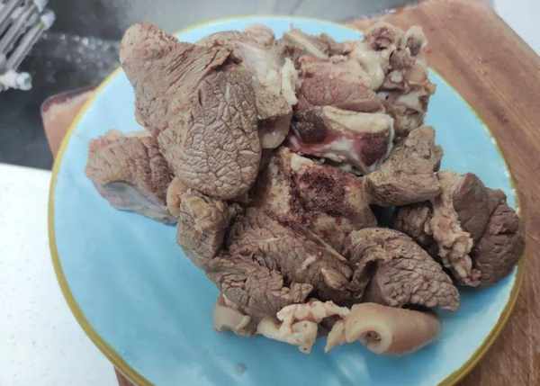 1.準備好的羊肉要清洗幹凈,沖洗幹凈之後撈出放在一旁。鍋裡面放入水,把水煮開,然後把洗凈後的羊肉放入鍋裡面焯水。焯水後立即撈出,過一下涼水放盆中備用;