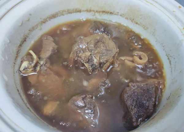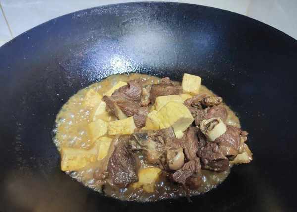4.燉煮好後裡面的肉質軟爛,湯汁還很多,倒在炒鍋裡面。在倒的時候一定要註意點,因為火滾滾的湯汁,它在下鍋的時候,會有蒸汽的產生,很容易被燙傷;