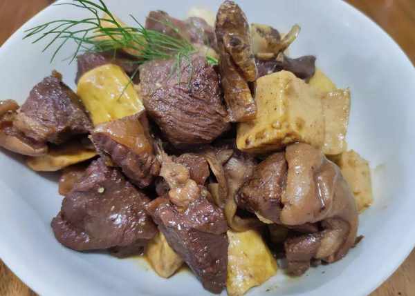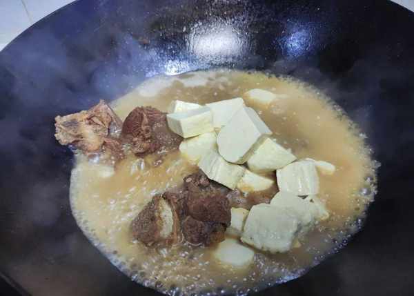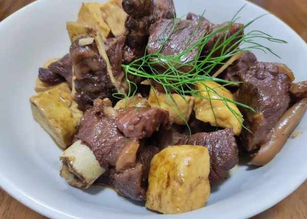在燜煮的過程中豆腐會吸收湯汁,使得豆腐的口感非常的咸香入味,好吃。等煮大鍋裡面的湯汁也收得差不多瞭,我們就可以關火出鍋,這樣子一份羊肉燜豆腐就完成瞭。