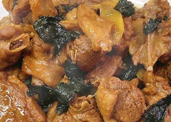 3、然後加入適量清水沒過食材,開大火煮開再轉小火燜煮半個小時。煮至醬汁濃稠,再放入提前洗凈的紫蘇葉,快速翻炒幾下炒入味即可出鍋裝盤開吃。