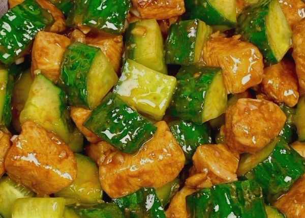3、起鍋燒油,油熱後放入醃制好的雞胸肉翻炒一會兒,煎至表面焦黃,就可以放入蒜末炒出香味,然後放入黃瓜翻炒均勻。