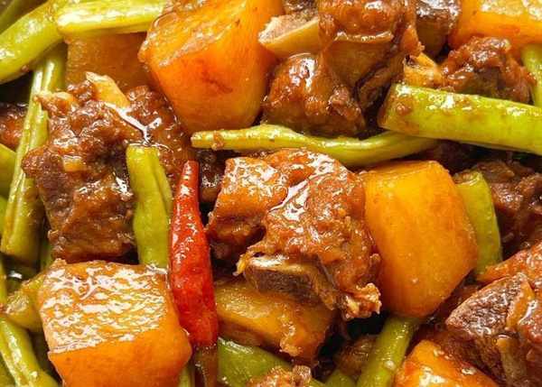 6、時間到,再放入土豆繼續燜煮十分鐘,然後放入四季豆燜煮十分鐘。最後開大火翻炒收汁即可出鍋裝盤開吃。